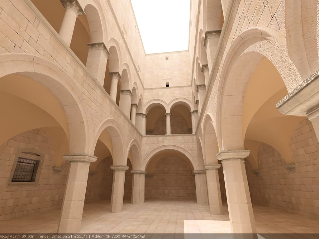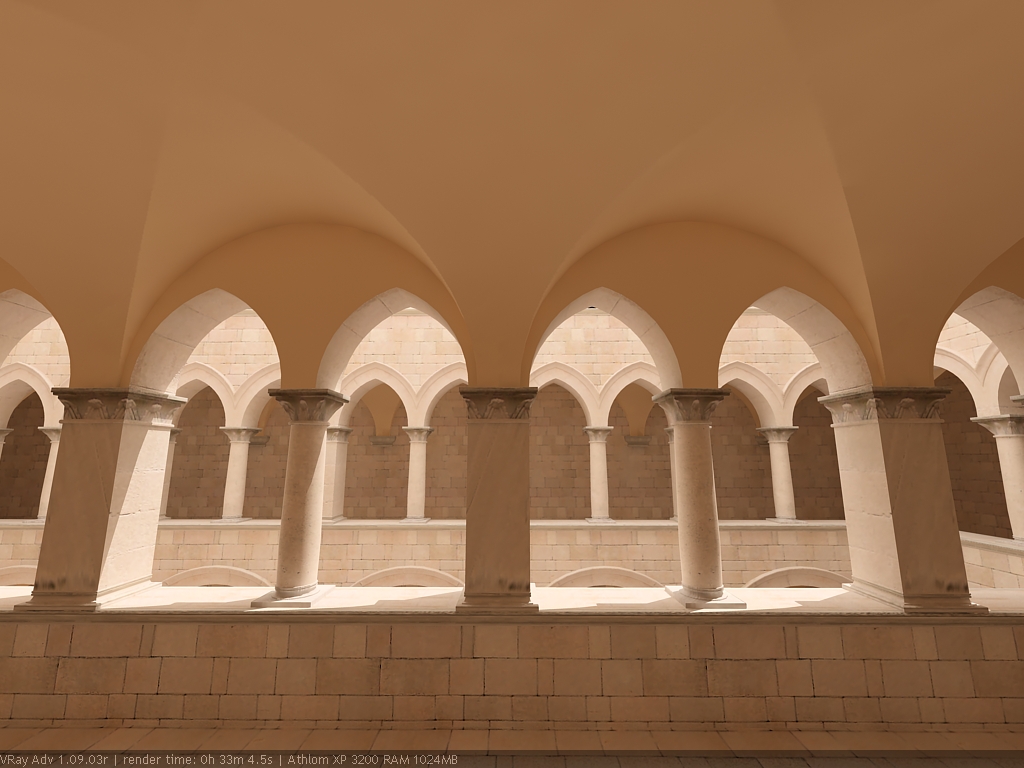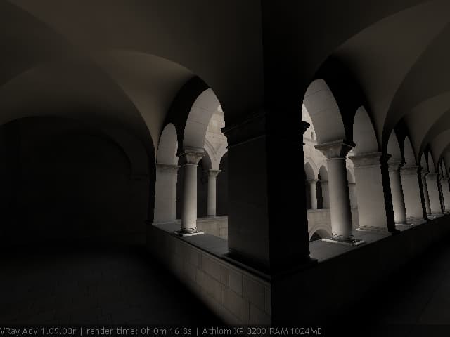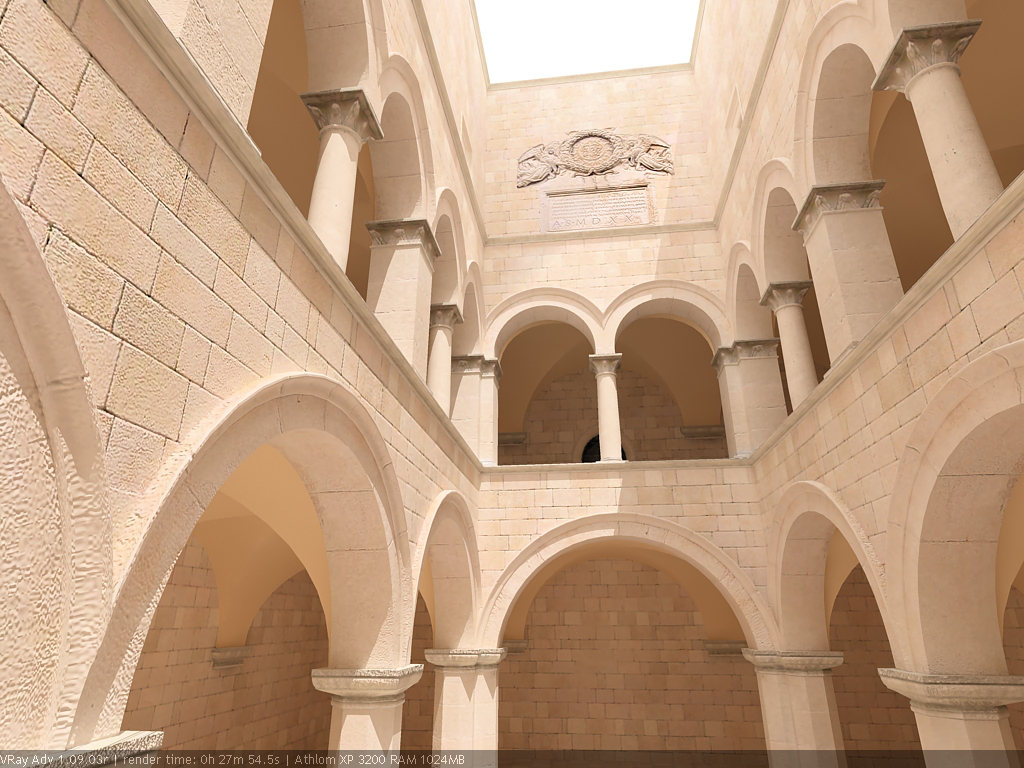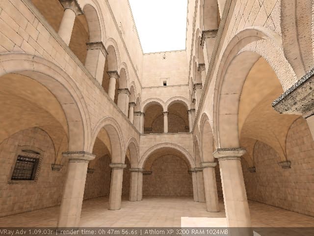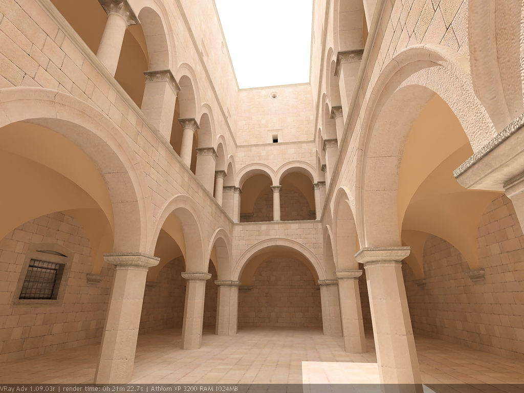Для настройки я выбрал сцену, которую можно найти в Интернете по адресу http://hdri.cgtechniques.com/~sponza/files. Выбор именно этой сцены обусловлен тремя причинами. Во-первых, сцена специально предназначена для тестирования возможностей различных рендер-программ и представлена во всех основных 3d-форматах. На том же сайте отображена обширная галерея уже выполненных рендеров этой сцены, так что есть возможность сравнить свой результат с достижениями других. Во-вторых, сцена являет собой некий промежуточный вариант - это не совсем интерьер, так же как и не полноценный экстерьер. Это внутренний дворик, наглухо ограниченный четырьмя стенами. Свет внутрь проникает сверху через довольно глубокий колодец, образованный стенами дома. В сцене есть второй этаж и область под балконами, и доступ прямому свету туда затруднен. В-третьих, сцена довольно велика - около 40 метров по длинной стороне. Оригинальная сцена создавалась в LightWave. На сайте есть ее версия, адаптированная под 3ds max с материалами, с ней и будем работать. Вот как это выглядит в scan-line рендере 3ds max: