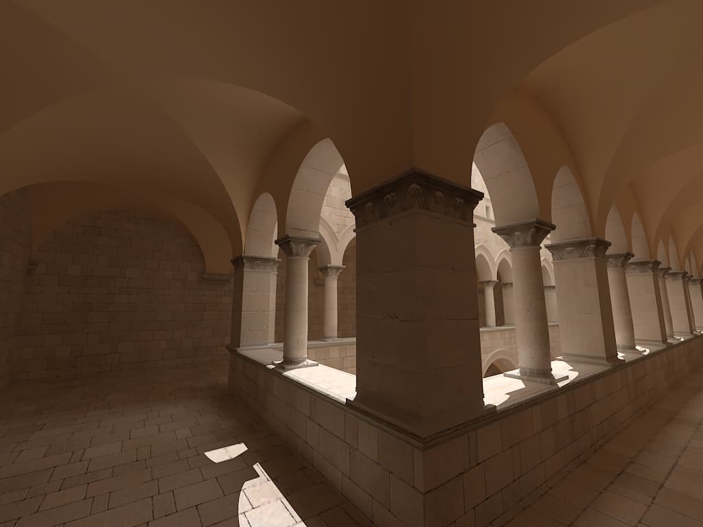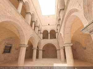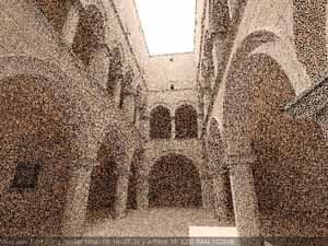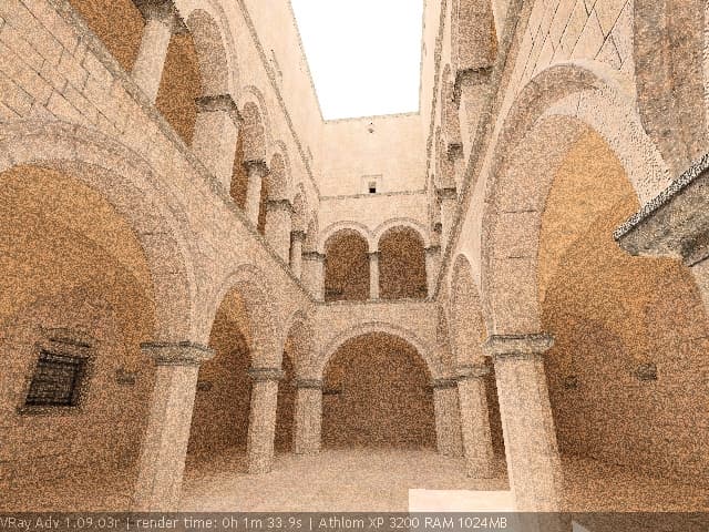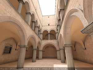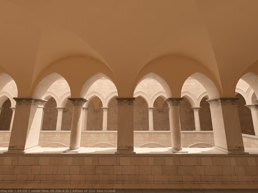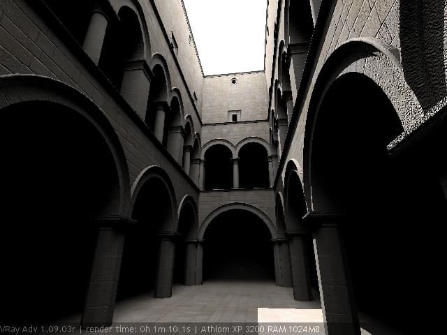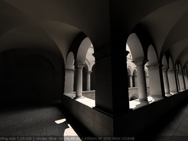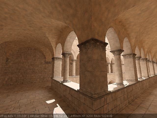 Для настройки я выбрал сцену, которую можно найти в Интернете по адресу http://hdri.cgtechniques.com/~sponza/files. Выбор именно этой сцены обусловлен тремя причинами. Во-первых, сцена специально предназначена для тестирования возможностей различных рендер-программ и представлена во всех основных 3d-форматах. На том же сайте отображена обширная галерея уже выполненных рендеров этой сцены, так что есть возможность сравнить свой результат с достижениями других. Во-вторых, сцена являет собой некий промежуточный вариант - это не совсем интерьер, так же как и не полноценный экстерьер. Это внутренний дворик, наглухо ограниченный четырьмя стенами. Свет внутрь проникает сверху через довольно глубокий колодец, образованный стенами дома. В сцене есть второй этаж и область под балконами, и доступ прямому свету туда затруднен. В-третьих, сцена довольно велика - около 40 метров по длинной стороне. Оригинальная сцена создавалась в LightWave. На сайте есть ее версия, адаптированная под 3ds max с материалами, с ней и будем работать. Вот как это выглядит в scan-line рендере 3ds max: