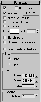 Второй источник света должен моделировать рассеянное освещение от небесного свода и потому обязательно должен быть пространственным (тип Area). В качестве такового можно выбрать ИС типа Skylight из набора 3ds max, и неплохо было бы с ним использовать подходящее изображение небесного свода в формате HDRI. Однако, учитывая то, что фотонные карты не могут работать со Skylight и HDRI, целесообразнее взять вместо него ИС типа VrayLight, которым и воспроизвести световой фронт. Впрочем, вариант с использованием Skylight+HDRI вовсе не исключен, просто здесь и сейчас я его рассматривать не буду.