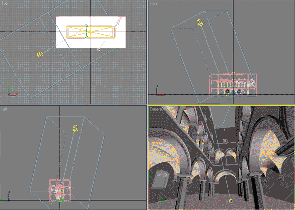 Настройка положения и высоты Target Direct в сцене выбиралась так, чтобы наиболее интересно осветить ту часть, которая видна в камере. Волновой фронт выбран прямоугольным (Light Cone>rectangle) для облегчения его проецирования на интересующую часть сцены так, чтобы минимизировать потери при излучении фотонов. Затухание обязательно отключаем (Decay>Type>None). В качестве типа теней был выбран VRayShadow со значениями по умолчанию.