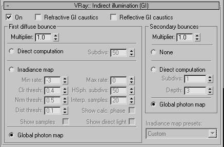 Снова переходим на закладку VRay: Indirect illumination и в качестве метода расчета первого диффузного отскока выбираем irradiance map. Для настроек irradiance map я выбрал Irradiance map preset>High, затем там же - Custom. Это позволяет редактировать настройки High.