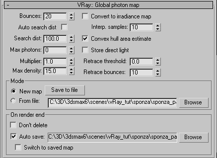 Как найти Max. photons? Начинаем постепенно повышать с 0 его значение с некоторым шагом (допустим, в 10 фотонов) и каждый раз рендерим изображение. Когда изображение в тех областях, где фотонная карта наименее плотна (темные и труднодоступные для освещения участки) перестанет меняться при увеличении Max. photons, текущее значение Max. photons и следует взять. Остается только сожалеть об отсутствии "штатных" средств оценки плотности фотонной карты в произвольной выбранной точке сцены.