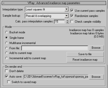 Выполнить настройку параметров самой карты довольно просто. Выбираем Interpolation type: Least squares fit. Еще может быть только один вариант - Delone triangulation, который не размывает интерполируемую освещенность, в отличие от всех остальных типов и может быть использован для изображений, к которым предъявляются повышенные требования к четкости. Наша сцена вполне обычна, поэтому оставлен Least squares fit. Sample lookup (способ выбора рассчитанных точек для интерполяции) - Precalc'd overlapping, лучший из имеющихся, оставляем. Устанавливаем Randomize samples, что должно подавлять муар и другие проявления алиасинга. Check sample visibility стоит включать только при наличии проблем в сцене, связанных с проникновением света через поверхности. В текущей сцене таких проблем нет, значит, не включаем.