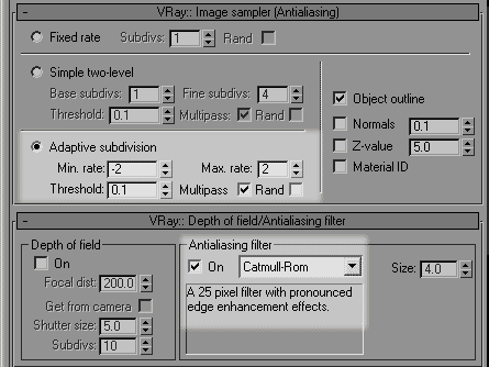 Поскольку сглаживание AA является дополнительным и независимым проходом по отношению к проходам расчета точек irradiance map, для настройки AA использовалась сохраненная в файл карта, как и для настройки Color map. Из фильтров AA общего назначения наиболее качественными являются Catmull-Rom и Mitchell-Netravali. Наиболее простой - Area. Эти фильтры определяют влияние пикселей изображения друг на друга и являются результатом исследований теории антиалиасинга. Другие фильтры этой группы предназначены для различных специальных случаев, описание которых можно найти в руководстве к VRay. Перед рендером я изменил разрешение изображения на 1024х768 и уменьшил значения Min. rate до -4, а Max. rate до -1. Поскольку количество точек изображения увеличилось, качество irradiance map не должно пострадать. Итак:
