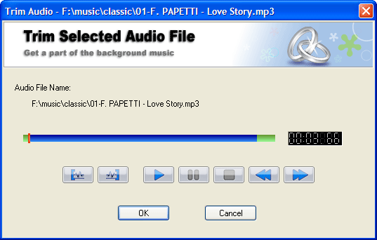 Фотографии более выразительны, если показывать их под музыку. Wedding Album Maker Gold позволяет добавлять музыкальное сопровождение в проект. Вы открываете аудио-файлы, которые имеют определенную продолжительность звучания. По умолчанию каждое фото показывается 2 секунды и столько времени уходит на эффект смены кадров. В нижней части рабочего окна приложения показывается полоса прогресса альбома, под которой располагается строка аудио. Вы можете видеть, на каком фото заканчивается одна песня и начинается другая. Здесь таится один большой недостаток Wedding Album Maker Gold. Некоторые аналогичные приложения позволяют выделять фрагмент слайд-шоу и синхронизировать его длину со временем звучания текущей композиции. Это очень удобно. Съемка у жениха – жесткая музыка, дома у невесты – нежность, выкуп – быстрая энергичная композиция, ЗАГС – 99% вероятности, что вам захочется услышать Марш Мендельсона. И так далее – под каждый сюжет используется свое звуковое сопровождение. А как действовать в данном случае, когда нет синхронизации? Предлагается несколько вариантов действий. Во-первых, в состав продукта входит инструмент, позволяющий отрезать у композиций начало и конец.