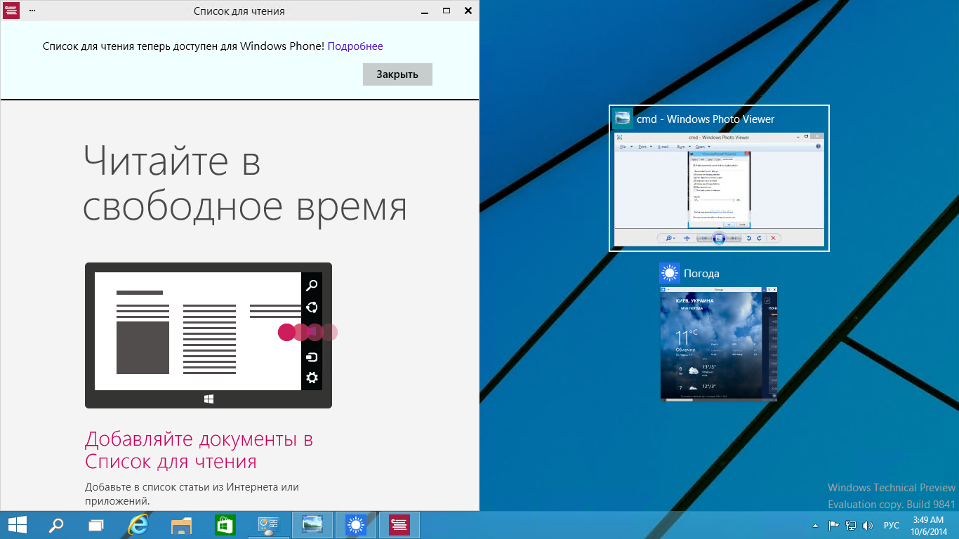 Универсальные приложения. Те самые, которые изначально назывались Metro, затем Modern, затем Windows Store, а теперь — Universal. Универсальность их понимается в самом прямом смысле — как способность (потенциальная) исполняться на всех типах устройств, от десктопов до Windows Phone и Xbox. Но в контексте десктопного режима Windows 10 TP они приобрели ряд важных новых особенностей. Во-первых, теперь такие приложения запускаются на рабочем столе, причем в оконном режиме: