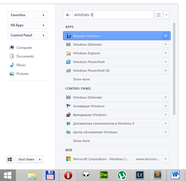 Все элементы интерфейса выполнены без особых изысков и, видимо, без особого желания адаптировать внешний вид «под Windows 8». Но главный недостаток – это неудобство меню. Вместо компактной кнопки выключения, все действия вынесены в список пунктов. Уже это занимает четверть рабочей зоны меню. Оставшиеся элементы сжаты с таким интервалом, что нужно приложить некоторое усилие, чтобы выбрать нужный пункт меню. «Мой компьютер», «Панель управления» и другие разделы при наведении отображают каскадное меню, что также заставляет усомниться в удобстве Power8.