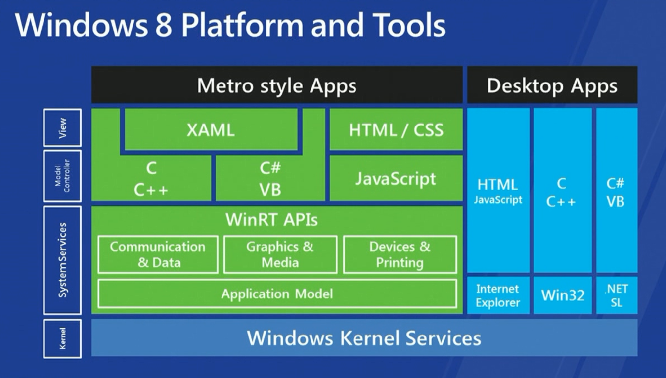 Нынешняя сборка Windows 8 не зря называется Developer Preview. Ее задача — продемонстрировать Metro независимым разработчикам, но не просто пользовательский интерфейс, а новую концепцию приложений для Windows. Основу последней составляет набор API под названием WinRT (Windows Runtime), совершено независимый от нынешних Win32 и .NET.