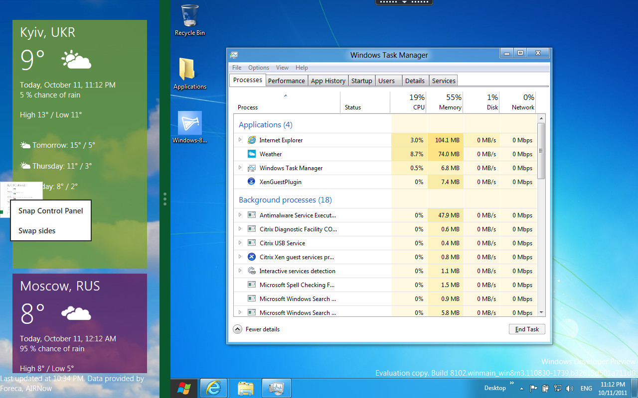 А вот впечатления от Metro на настольном ПК совершенно обратные — увидеть в нем какой-либо смысл при работе с клавиатурой и мышью сложно. Отчасти это, конечно, объясняется неготовностью нынешней сборки Windows 8 Developer Preview к «большому плаванию». Руководитель ее разработки Стив Синофски недвусмысленно заявил, что в текущей сборке присутствует едва ли 20% будущих нововведений. В результате, для комфортной работы с Metro банально не хватает клавиатурных комбинаций, что, конечно, накладывает свой отпечаток. И если эту проблему легко исправить, то базовые принципы Metro (в том числе, крупные плитки на стартовом экране, выезжающие панели и другие элементы управления) хоть и выглядят чужеродными при работе с мышью на большом экране, но, вероятно, уже пересматриваться не будут.