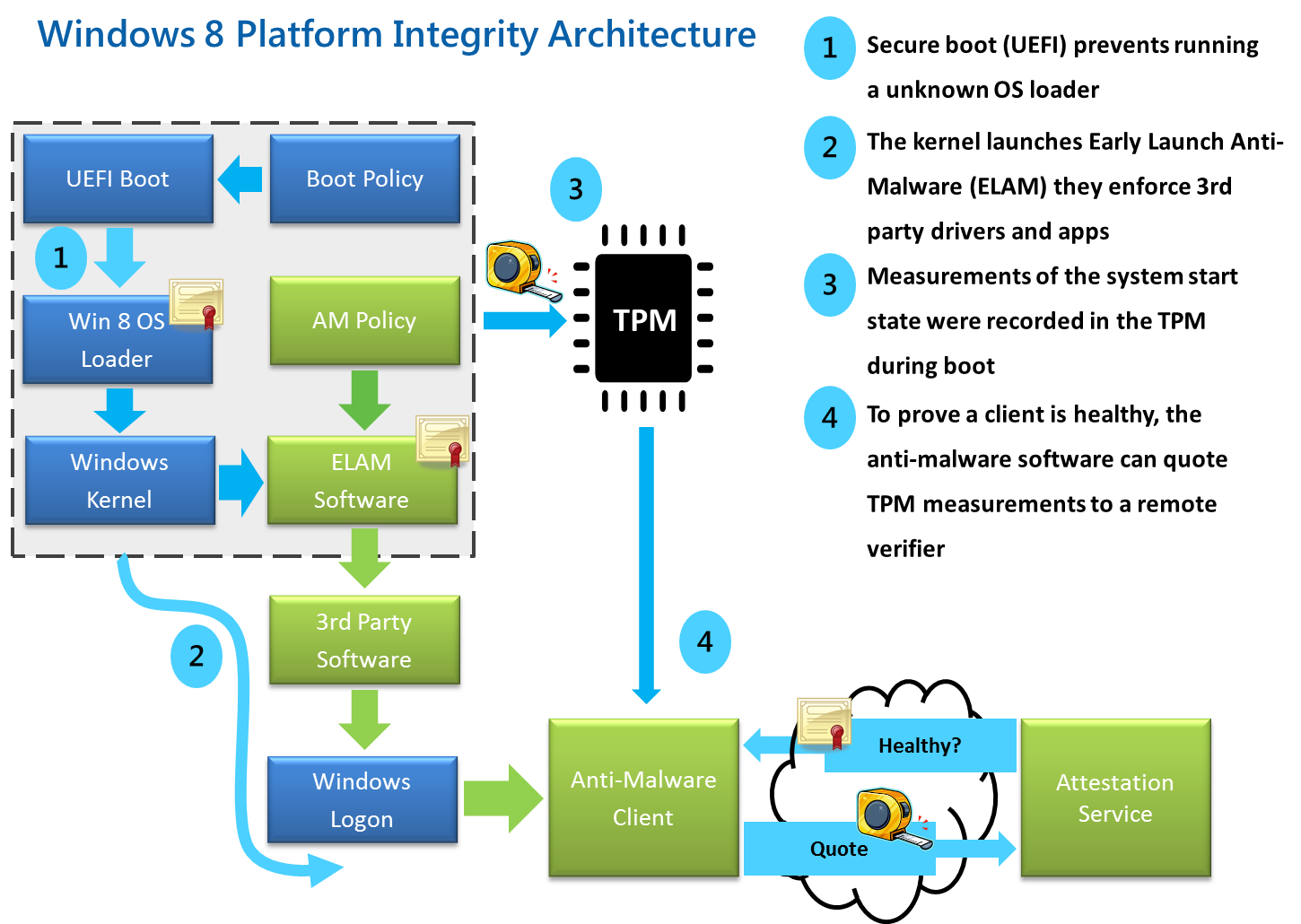 Как видно на схеме, весь процесс достаточно сложен, но суть его вкратце состоит в проверке неизменности важных элементов системы. Для загрузчика, ядра ОС и некоторых других компонентов будут сверяться цифровые подписи, а также будут выполняться дополнительные проверки — к примеру, на заражение вирусами. В частности, это означает, что без дополнительных действий в систему нельзя будет добавить новую ОС, которая перезапишет загрузочный сектор, из чего многие сделали вывод, что таким образом Microsoft препятствует распространению Linux. На самом же деле, безопасная загрузка — функция именно микропрограммы UEFI, а необходимые цифровые сертификаты будут предоставлять производители компьютеров. На их же совести — и возможность отключения всех проверок в настройках микропрограммы.