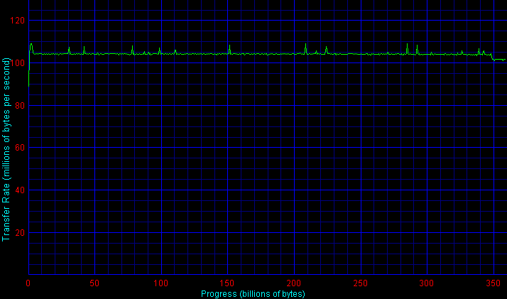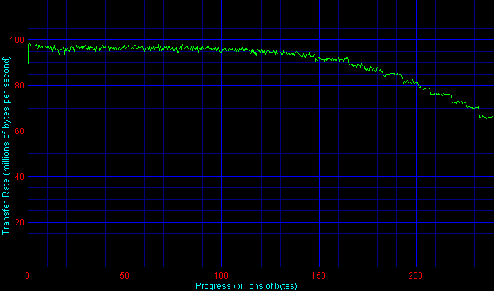 Если для контроллера 3ware Escalade 8500 (как и для Silicon Image SiI3114) графики скорости линейного чтения массивов RAID 10 (из четырех дисков WD1200SD) и RAID 5 из трех таких дисков практически равны «удвоенному» (по обеим осям) графику для одиночного диска WD1200SD, причем в данном случае для контроллера 3ware Escalade 8500 на «медленной» шине PCI не видно следов ограничения скорости массива из-за недостаточно высокой полосы пропускания шины PCI (сравните графики для PCI32 и PCI64), то для контроллера Adaptec 2410SA все исследованные массивы оказались «обрезанным» сверху по скорости примерно на уровне 100-105 Мбайт/с, то есть «недобрали» как минимум около 10% скорости в начале диска, а при размере блока чередования 64 Кбайт скорость упала еще ниже — до 85 Мбайт/с! В результате, четырехдисковый RAID 5 на AAR-2410SA оказался явно вне своей категории по скорости линейного чтения в начале и середине массива.