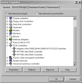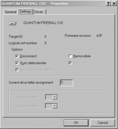 Устанавливаем плату, подключаем шлейфы, как сказано, включаем компьютер. Плата — ASUS P2B, ревизия BIOS — 1008. Операционная система — Windows 98. Ага, система радостно находит PCI Mass Storage Device и просит драйвера. Ставим драйвера, перезагружаемся. Ага, появились новые SCSI-контроллеры. Сразу хочется посмотреть, что же мы там можем настроить. И сразу первое разочарование — настроить нельзя ничего! Вот так вот. Ну что же, посмотрим, как поменялась закладка Settings в свойствах жесткого диска. Теперь мы имеем дело не с абстрактным диском GENERIC IDE TYPE XX, а с вполне конкретным с конкретной версией firmware. Пустячок, а приятно! Что вполне естественно, пропал флажок DMA.