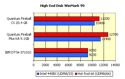 Итак, WinBench 99. Результаты приведены в таблице. В скобках приведены цифры загрузки процессора при выполнении конкретного теста. Для каждого диска в колонке UDMA/33 приведены результаты тестов при подключении к контроллеру системной платы, в колонке UDMA/66 — при подключении к контроллеру HotRod.