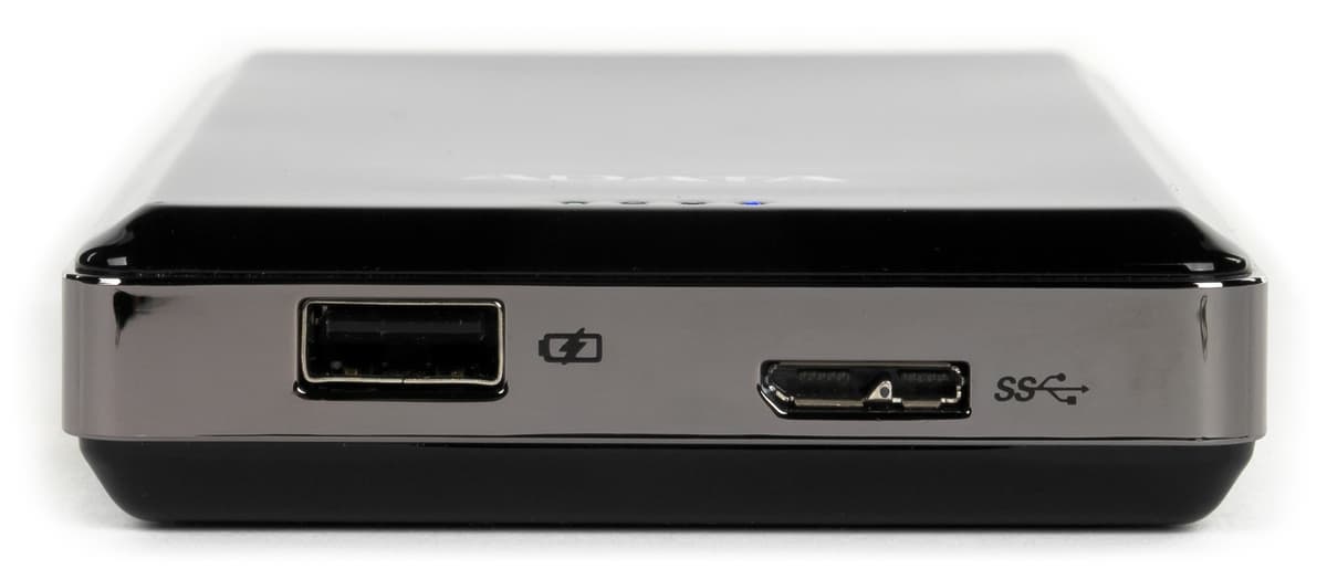 На нижнем коротком торце расположен порт micro USB 3.0 для подключения к ПК и зарядки встроенной батареи, а также выход USB Type A для подключения кабеля зарядки мобильных устройств. На левом торце находится включатель питания накопителя и отверстие скрытой кнопки сброса настроек.