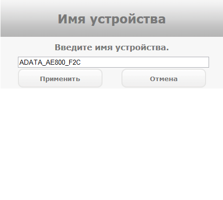 По умолчанию беспроводная сеть имеет имя AData_AE800_F2C и пароль 12345678. Последние три знака имени сети индивидуальны для каждого устройства и являются частью MAC-адреса беспроводного интерфейса.