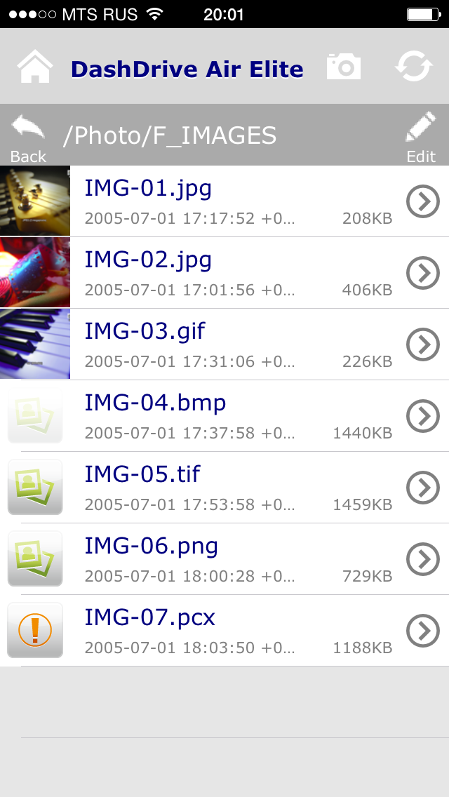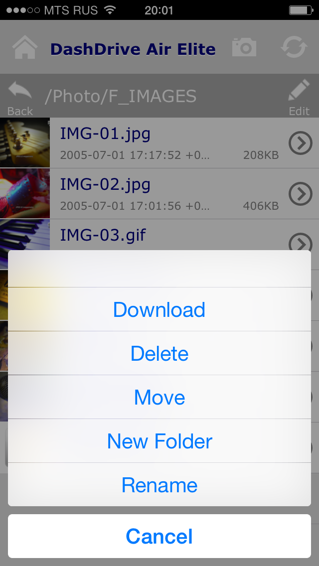 Возможности программы для iOS немного отличаются. В частности она может показывать и изображения в формате tiff, а в контекстном меню доступны операции загрузки файла и публикации его в популярных социальных сетях. Из музыкальных форматов пропал aac, а для видео остался только mp4.