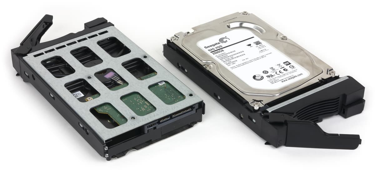 Размеры накопителя составляют 108×232×163 мм. Передняя панель выполнена из черного матового пластика. В левом верхнем углу расположены кнопка включения со встроенным индикатором питания и индикатор статуса. Ниже находится индикатор активности сетевого соединения и блок из разъема USB 3.0, кнопки и еще одного светодиода. В правом верхнем углу можно заметить приемник ИК-сигналов пульта дистанционного управления, который используется при реализации сценария медиаплеера. Отсеки для жестких дисков имеют простые защелки для рамок, замки здесь не предусмотрены. Отметим, что для каждого диска предусмотрена индикация его состояния и активности.