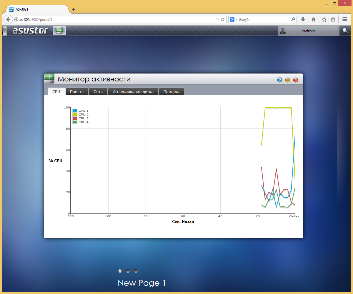 Если же требуется оперативно оценить текущую нагрузку, то нужно воспользоваться модулем «Монитор активности». Он показывает графики загрузки процессора и оперативной памяти, а также приема и передачи данных по сети. Дополнительно есть диаграмма занимаемого общими ресурсами пространства на дисковых томах и список процессов.