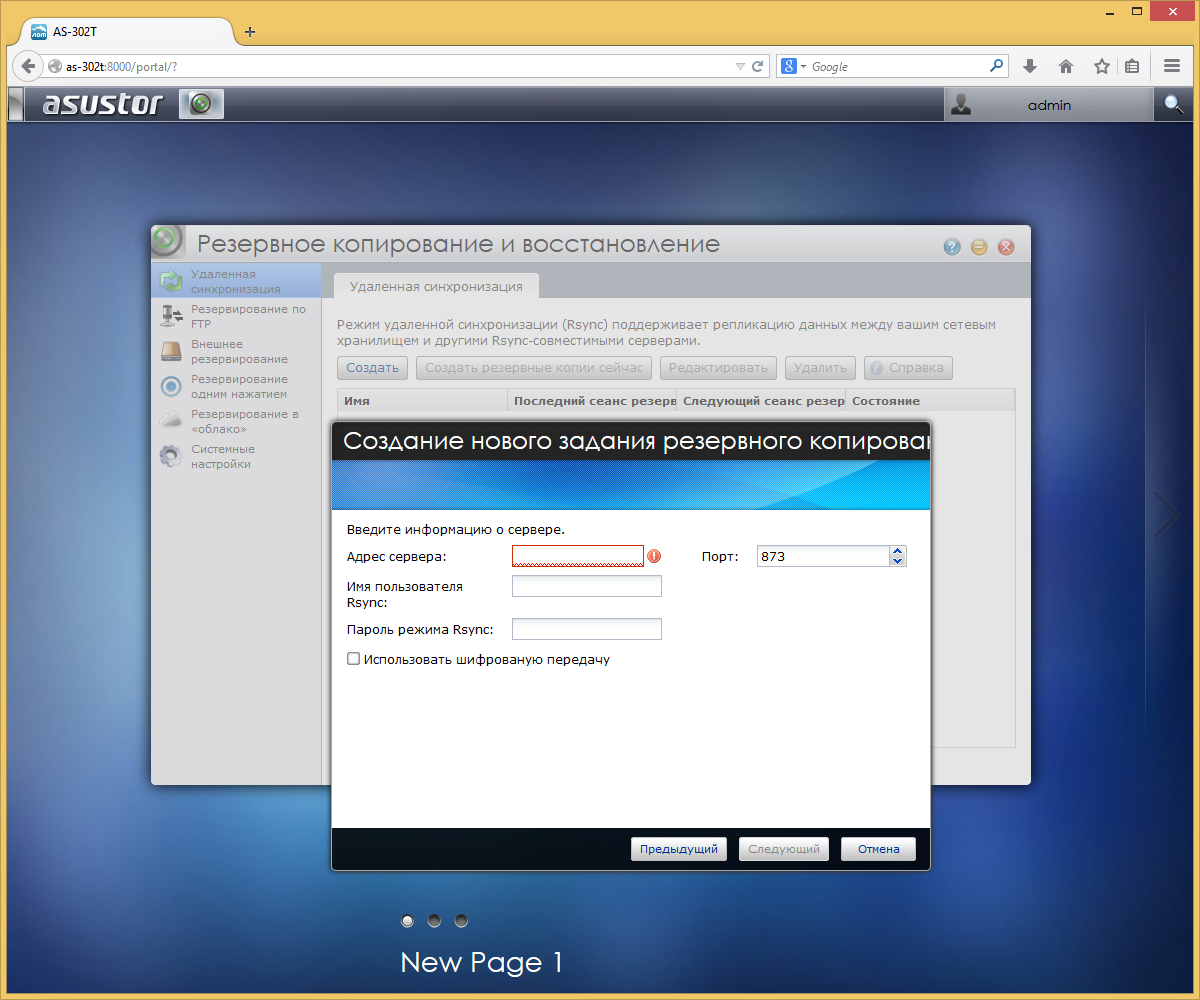 Еще более востребованными во многих случаях будут функции резервного копирования. Сетевой накопитель может осуществлять резервное копирование своих общих ресурсов по сети с использованием протоколов Rsync (в том числе и выступать в роли сервера для других устройств) и FTP, а также локальное копирование на внешние винчестеры. Поддерживается также выбор направления передачи данных и программирование расписания для этих задач. Функция резервирования одним касанием позволяет использовать кнопку на передней панели для запуска резервного копирования с использованием подключенного внешнего накопителя.