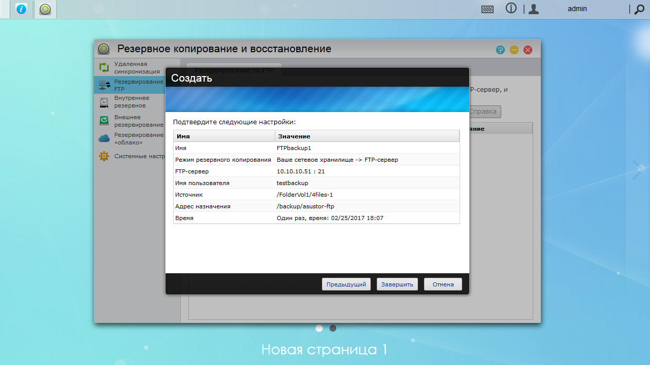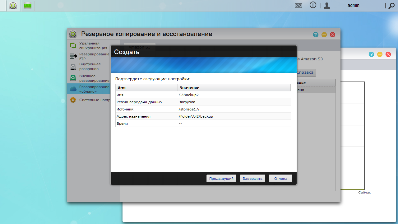 Далее вам будет представлены выбранные параметры в виде списка и после нажатия кнопки «Завершить» задача будет создана. При этом в журнале сетевого накопителя появится соответствующее сообщение. Там же будет предоставлена информация о времени запуска и окончания заданий.