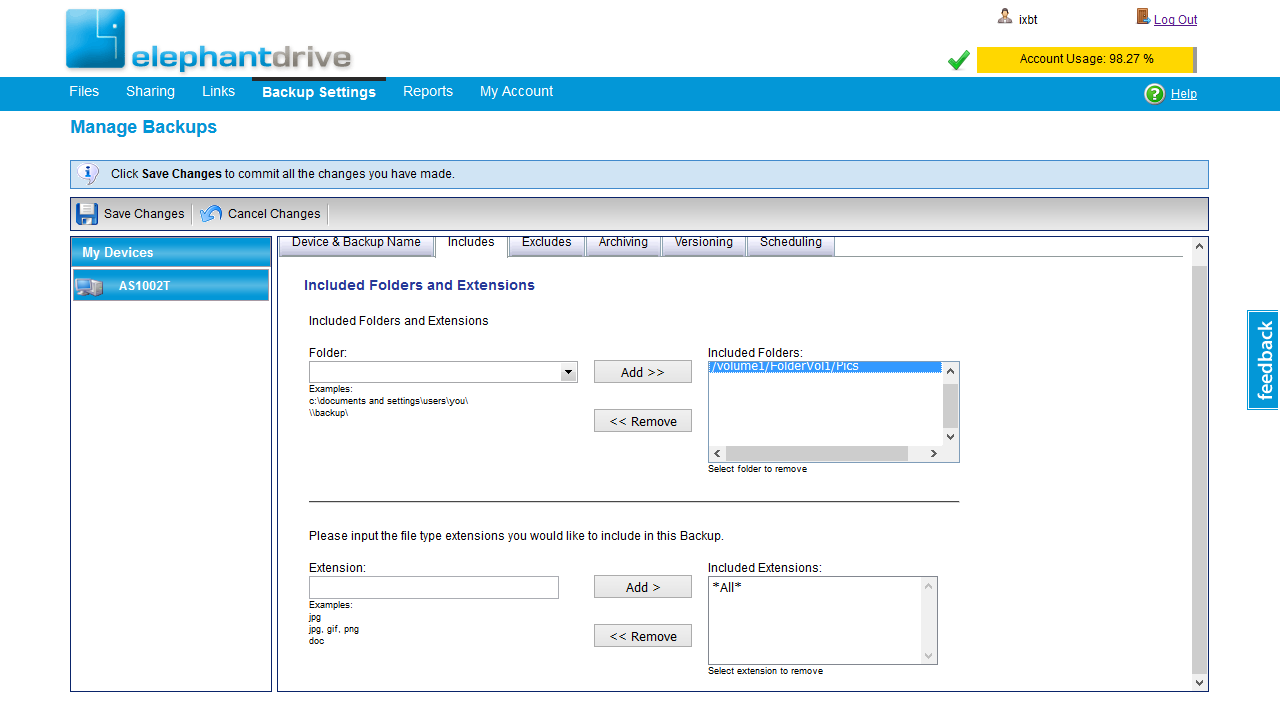 Поддержка облачного сервиса хранения данных ElephantDrive достаточно часто встречается в сетевых накопителях. Бесплатно здесь предоставляют 2 ГБ с ограничением на объем одного файла в 100 МБ, а число подключенных к аккаунту устройств не может превышать трех. Есть доступ к документам через браузер и утилиты для мобильных устройств. После подключения сетевого накопителя к сервису, управление резервным копированием и восстановлением данных с него осуществляется через общую онлайн-панель облака.