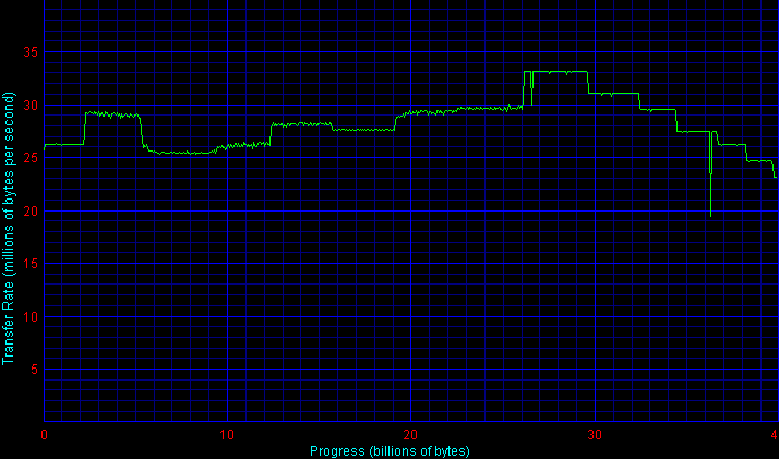 Гораздо более интересной оказалась ситуация на рынке высокоскоростных мостов IDE-FireWire. Здесь максимальная скорость могла отличаться в несколько раз. Причем такое различие я наблюдал у устройств одной фирмы, собранных на разных чипах мостов FireWire-IDE. Любопытно, что оба чипа были от одной фирмы-производителя. Ниже вы можете взглянуть на результаты сравнения.