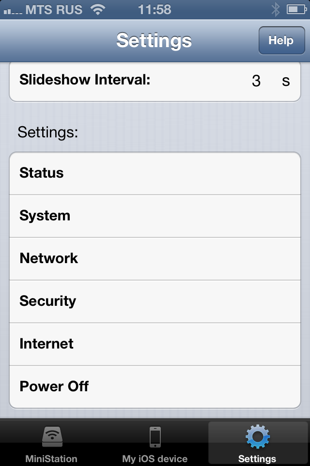 В этой же программе есть возможность изменения параметров работы накопителя (в частности имени основной беспроводной сети и параметров безопасности), настройки подключения к внешнему роутеру и выключения питания.