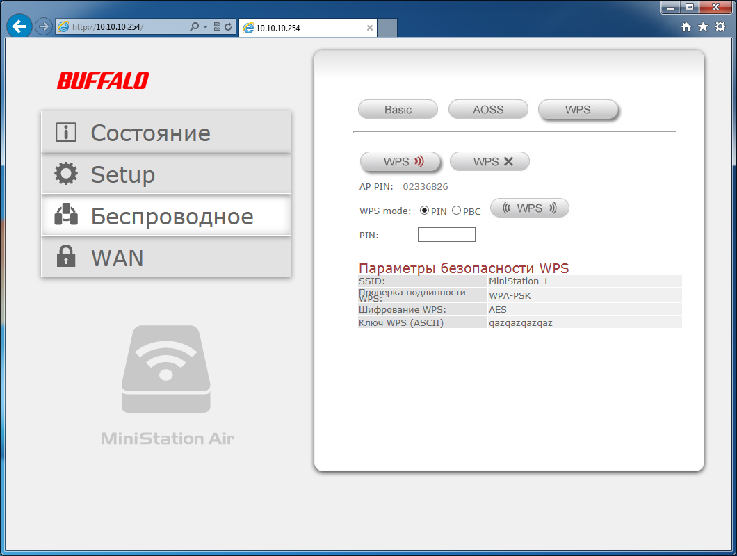 Последняя страница — WAN — используется для организации дополнительного подключения накопителя к существующей точке доступа, что позволит его клиентам сохранить доступ к интернету. Поддерживаются технологии AOSS и WPS, а также ручная настройка параметров. В этом режиме сервисы накопителя остаются доступны только по Wi-Fi, что позволяет использовать его в публичных сетях, а клиенты работают с использованием технологии NAT. Скорость доступа ожидаемо снижается, однако остается достаточной для большинства приложений — около 20 Мбит/с для одноканального режима.