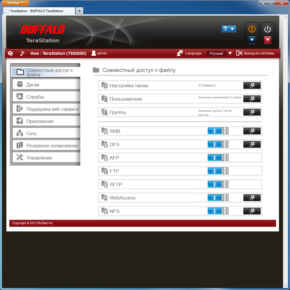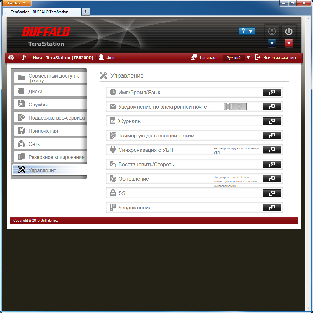 В верхней части окна находятся кнопки просмотра статуса и выключения/перезагрузки. Жаль, что информация о системе приводится в достаточно кратком виде — сетевое имя, версия прошивки, серийный номер, IP- и MAC-адреса сетевых портов, рабочая группа и заполненность дисков. В отличие от других производителей, Buffalo не предоставляет администратору информации о загрузке процессора и оперативной памяти. В условиях жестко ограниченного набора сервисов такое решение вполне оправданно.