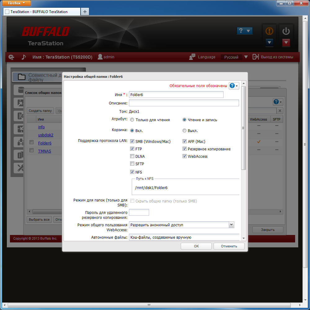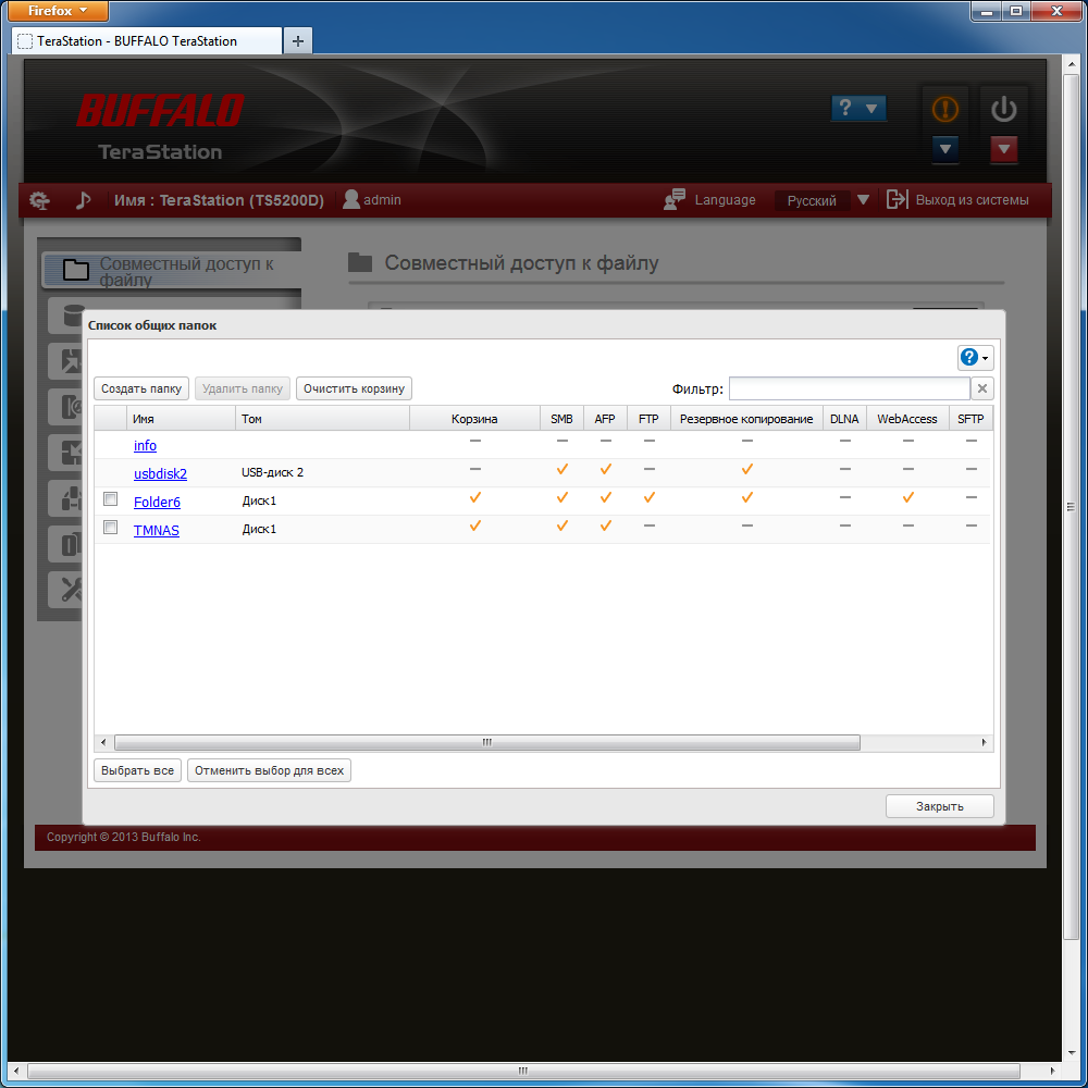 Здесь же настраиваются протоколы сетевого доступа — SMB, AFP, FTP, SFTP, NFS. Особых настроек у них нет, что для сервера FTP несколько странно, поскольку возможность изменения номеров портов и ограничение скоростей используется достаточно часто. Пассивный режим сервером поддерживаются, а вот с кодировкой UTF-8 есть какие-то проблемы — с записанными по SMB файлами с русскими именами что-либо сделать через FTP не получилось. Отметим также реализацию DFS. Интересно, что можно выбрать для каждого общего ресурса список протоколов для работы с ним. Предусмотрена корзина для удаленных по сети файлов. Для ограничения доступа по NFS есть только возможность указать адреса клиентов, которые будут иметь полные права на все экспортируемые ресурсы.