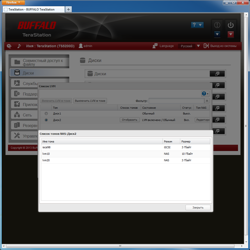 iSCSI работает только в блочном режиме, что необычно для данного класса устройств. Кроме того, это существенно ограничивает возможности в случае двухдисковой модели. Сервис имеет множество настроек, в частности есть разрешение доступа к тому только определенному клиенту.