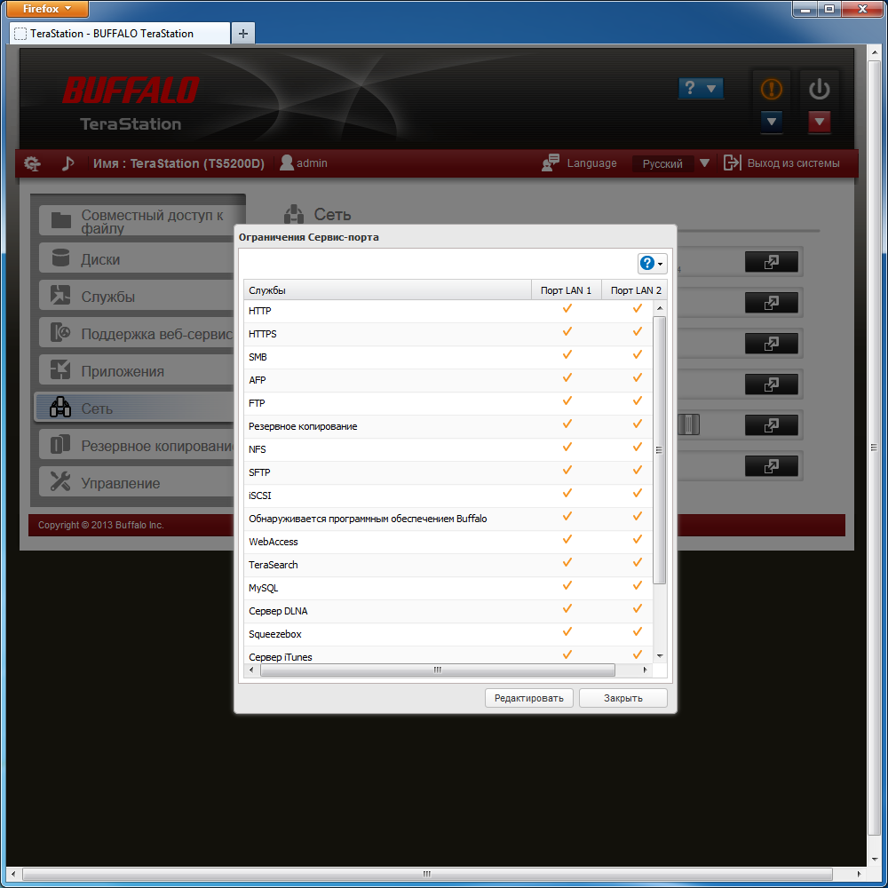 Несмотря на то, что устройство позиционируется в бизнес-сегмент, на нем реализованы некоторые мультимедийные сервисы. В частности, это DLNA, iTunes и Squeezebox. Для первого можно установить ограничения на доступ клиентов, а для выбора ресурсов нужно поставить соответствующую галочку в опциях общих папок. Поддерживается большинство современных форматов мультимедиа, включая видео в MP4, M2TS и MKV. Удаленная библиотека iTunes работает только с одной выбранной папкой. К сожалению, с последней версией программы для ПК сервис оказался несовместим.