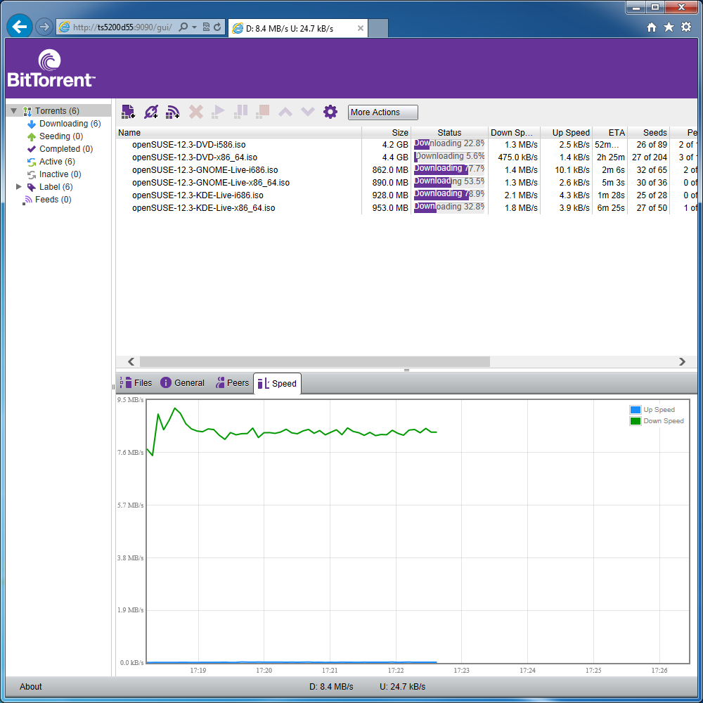 Отметим наличие встроенного клиента для автономной загрузки файлов по протоколу BitTorrent. Он представлен известной утилитой µTorrent, для управления которой используется ее собственный web-интерфейс (WebUI), защищенный паролем. Число заданий можно считать неограниченным, набор настроек отличается разнообразием, скорость работы клиента очень высока, после загрузки задания возможна его раздача. Для быстрого добавления заданий из браузера можно использовать соответствующие плагины.