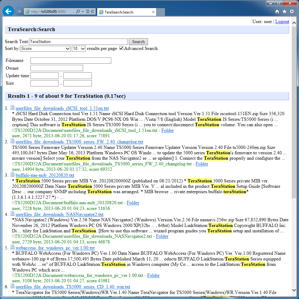 Необычно выглядит приложение TeraSearch, позволяющее осуществлять поиск по ключевым словам в текстовых документах (включая форматы doc и docx), записанных на сетевой накопитель. При этом используется предварительная индексация указанных пользователем папок. Сервис имеет собственный интерфейс и дополнительные опции поиска (владелец, размер, дата изменений и другие).