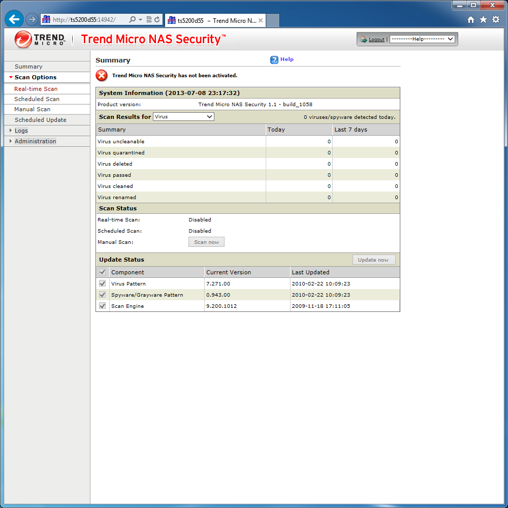 Есть в данной модели и более традиционные сервисы в рассматриваемом сегменте — web-сервер и сервер MySQL. Для первого есть поддержка PHP и Perl, а для второго — установленный модуль управления phpMyAdmin. Как одно из преимуществ серии TeraStation производитель называет встроенный модуль антивирусного сканирования, основанный на решении Trend Micro. Однако он требует отдельной лицензии и активации, а в комплекте нашего семпла такой опции не было. Судя по документации, сервис умеет обновлять базы через интернет и проводить сканирование выбранных папок в нескольких режимах.