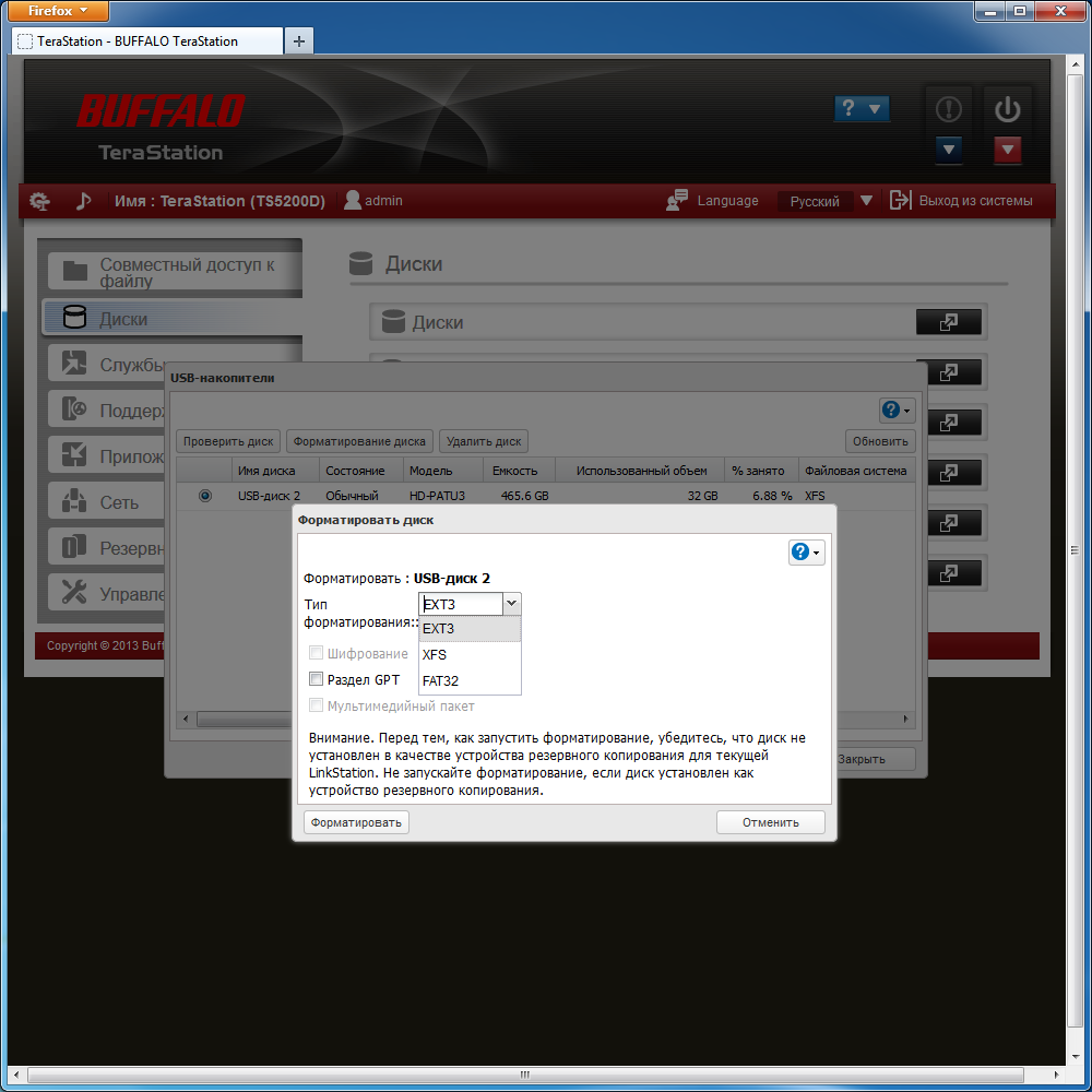 Про внешние винчестеры известно только то, что устройство «видит» только первый раздел, который представляется по сети в виде общей папки. Протоколы и права доступа к ней можно изменить. Однако некоторые возможности могут быть недоступны, например NFS. Про поддерживаемые на внешних дисках файловые системы информации в документации найти не удалось. Судя по возможности форматирования диска в FAT32, EXT3 и XFS через web-интерфейс, эти варианты полностью поддерживаются. Также мы проверили и подтвердили работоспособность NTFS. Безопасное отключение внешних накопителей можно осуществить через web-интерфейс или кнопку на передней панели устройства.