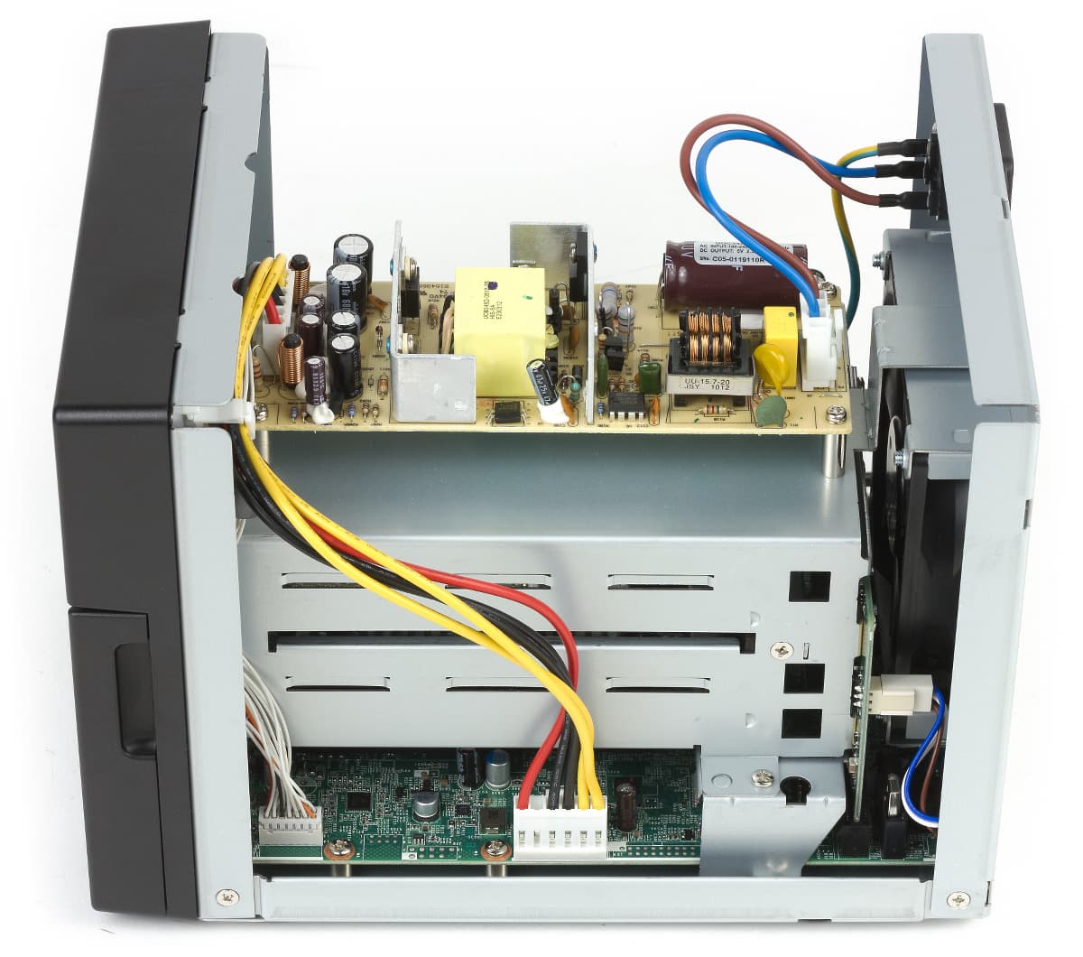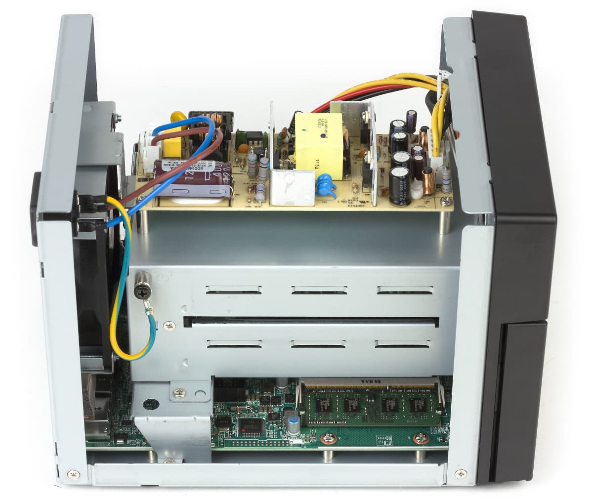 На прочном металлическом каркасе закреплены печатная плата блока питания (корпуса у него нет, а формат нестандартный), бекплейн для дисков и основная начинка. Обращает на себя внимание то, что никаких дополнительных вентиляторов нет — ни для блока питания, ни для чипсета или процессора. На последних установлен только крупный радиатор. Учитывая, что другие производители в корпус такого размера устанавливают четыре винчестера, свободного места в TeraStation 5200 много.