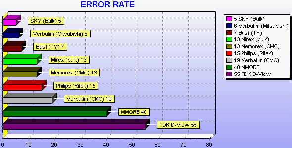 В числе предложений и поправок, пришедших после публикования первой части тестирования были и вопросы связанные с определением некоего «порога» для CD-R диска, исходя из результатов испытаний. То есть, какой максимальный числовой результат говорил бы о том, что диск не пригоден для записи. Откровенно говоря, этот вопрос поднимался еще перед первой публикацией. Проведя массу вычислений и проконсультировавшись с инженерами УЭЗ мы, к сожалению, пришли к выводу, что получение подобной максимальной цифры математическим путем не представляется возможным. Связано это с тем, что результаты формируются на основании средних значений десяти точек в которых были осуществлены измерения. Помимо этого, стоит учесть, что при вычислении, например, комплексной характеристики CD-R диска «Error rate» берутся во внимание результаты нескольких параметров, тестируемых CDCATS SA3. Определенные спецификацией «Оранжевая книга» допустимые границы для каждого из этих параметров, хоть и имеют фиксированные значение, тем не менее, важным является и участок диска, на котором был получен результат.
