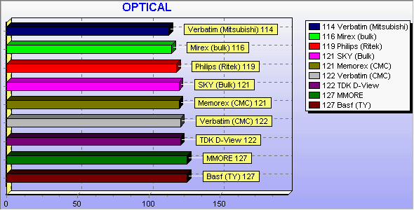 Поэтому наиболее правильным, на наш взгляд, был бы не поиск «эталона отстойности» CD-R диска, а сравнение полученных результатов, на основе которого можно было бы делать более-менее определенные выводы. Наиболее наглядной картина может стать при наличии возможности отслеживания тенденции изменения (или не изменения) характеристик диска. В наших планах присутствует создание некоей постоянно пополняемой «библиотеки CD-R дисков», в которой помимо иллюстрации и ATIP диска, будет постоянно пополняться информация о результатах испытания этого диска (в случае если CD-R попадал в число тестируемых), что позволило бы уже отслеживать тенденцию изменения или сохранения уровня качества какого-либо «брэнда».