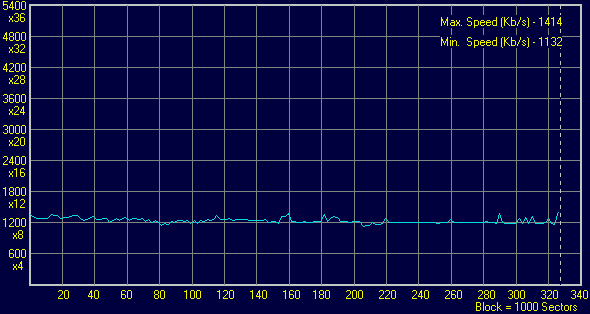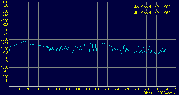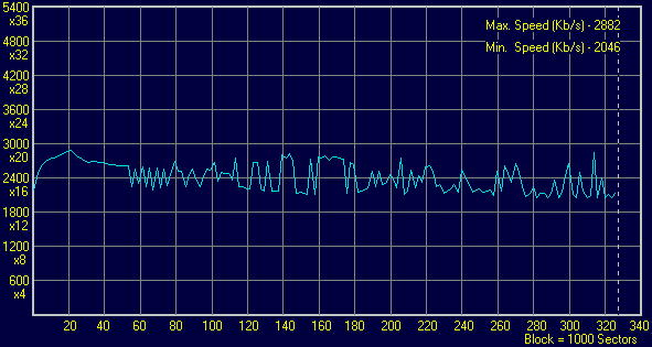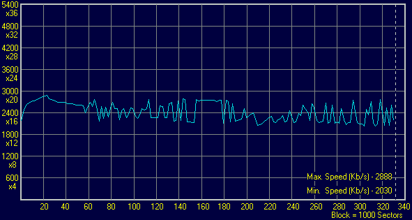 Золотой диск прочитался так же, как и записанные в нашем тесте CD-R, т.е. с такой же «пилой». График чтения поцарапанного CD более интересен. На нем мы можем наблюдать резкие спады и незамедлительное восстановление скорости, что говорит только в пользу дисковода. И лишь дойдя до самого трудного участка на крайних дорожках диска, HP 9710i снизил скорость до 9х, сохранив ее до конца тестирования.