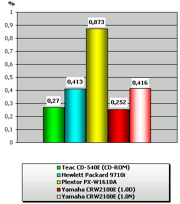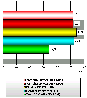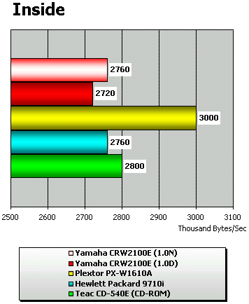Здесь 9710i уже вплотную подобрался к CD-ROM TEAC, существенно обогнав Yamaha. Даже обновление микропрограммы не дало возможности 2100Е продемонстрировать близкие к cd-writer 9710i показатели. PlexWriter PX-1610A по-прежнему недосягаем для HP.