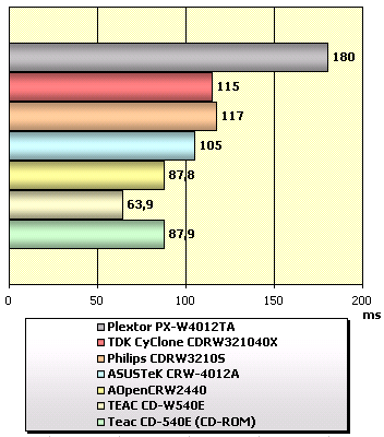 Определенно, дисковод TEAC всерьез намерен побить все рекорды. К нему вплотную приблизился Plextor, недобрав семи сотых. Неплохие показатели и у CRW-4012A.