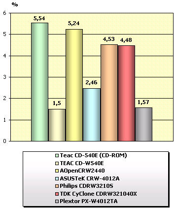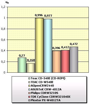 При столь высокой скорости передачи данных, TEAC CD-W540E продемонстрировал самый низкий (!) процент загрузки процессора. Тот же ASUS, при высокой скорости работы, столь же ощутимо «грузит» процессор. Достаточно существенно загружает процессор во время передачи данных и дисковод от AOpen. Все остальные дисководы не выходят за пределы 0,5%.