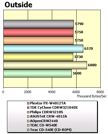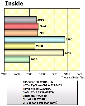 Все современные сорокаскоростные CD-RW дисководы отлично справляются с чтением компакт-дисков, значительно опережая CD-540E. Несомненными лидерами в данном тесте стали 48x дисководы от ASUS и TEAC. Остальные же рекордеры продемонстрировали примерно одинаковые результаты.