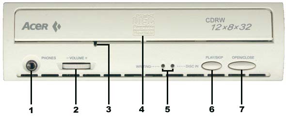 Традиционная откидывающаяся крышка лотка (4), разъем для наушников (1), механический регулятор громкости (2), кнопка для выдвижения лотка (7), кнопка для проигрывания музыкальных компакт-дисков без участия дополнительных утилит (что нечасто встретишь у CD-RW дисководов) (6), два индикатора работы привода (5) и отверстие на случай аварийного извлечения диска (3). На задней панели присутствует цифровой выход.