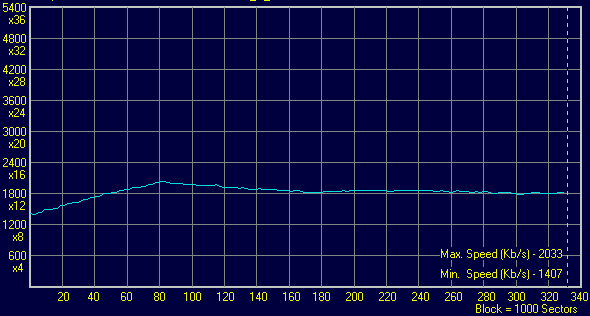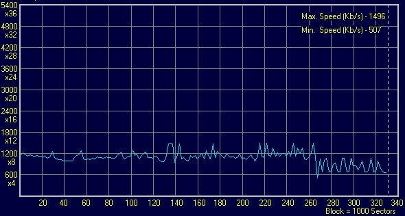 Этот тест я решил провести для полноты информации, и, надо сказать, результаты получились весьма занятные. Не стоит забывать, что структура диска сложная и неоднородная, вследствие чего получились достаточно невысокие результаты даже для 32-х скоростных устройств.