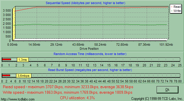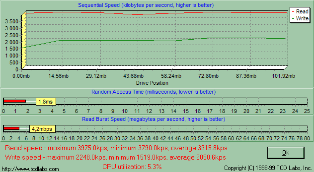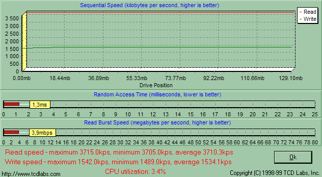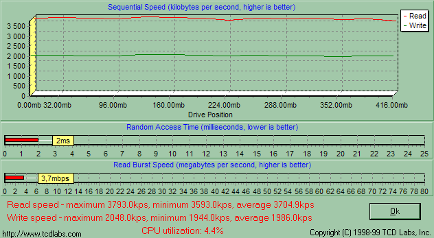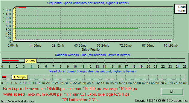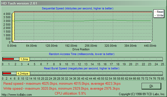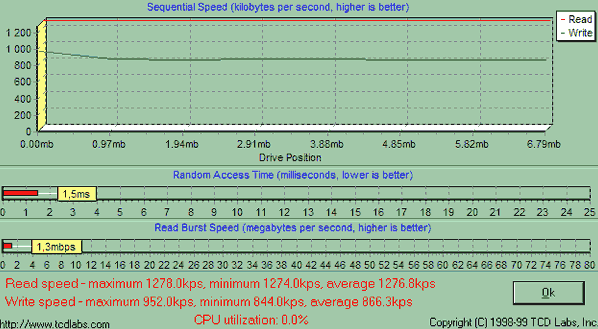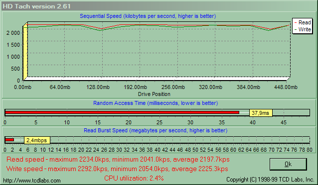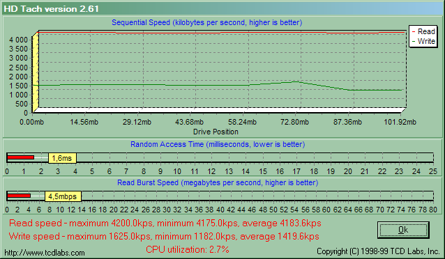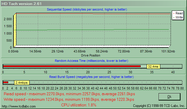 Остальная конфигурация на сегодняшний день достаточно типична и особого влияния на результаты тестирования не оказывает. Скажу лишь, что тестирование проводилось под управлением Windows XP Pro, а тем, кто решит прикинуть, какого это процессора загрузка имеется ввиду на графиках, сообщу, что это Athlon XP 1900+. Для тестирования в основном применялся HD Tach 2.61, которым я пользуюсь постоянно, и вот почему. Winbench 99 не определяет скорость записи, которая нам вообще-то наиболее важна (запись фотографий в ЦФК — та задача, когда терпеть и ждать не можно). Кроме того, этот тест иногда умудряется скосячить и со скоростью чтения. Заниматься же копированием файлов разного размера и количества тоже не очень хотелось, так как результаты такого «теста» под управлением современных версий Windows повторяемы с большим трудом, так что верить им безоговорочно не стоит. К тому же, время доступа при этом можно оценить лишь косвенно. Впрочем, HD Tach тоже имеет норов, поэтому я использовал все три метода (вдруг между ними будет большое расхождение), но, поскольку полученные разными способами результаты хорошо корреллируют друг с другом, оставил в статье лишь данные HD Tach.