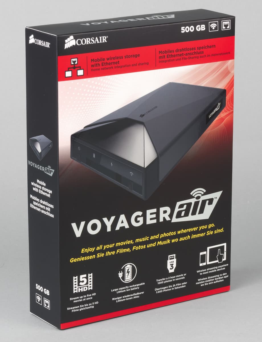 Corsair Voyager Air представлен на рынке в нескольких версиях, которые отличаются по объему (500 ГБ и 1 ТБ), цвету корпуса (черный или красный) и типу сетевого блока питания в комплекте (для США или Европы). Устройство имеет встроенную точку доступа Wi-Fi и проводной гигабитный сетевой интерфейс, что упрощает использование в составе домашней сети и добавляет новые сценарии работы, например резервное копирование или высокоскоростной сетевой доступ к общим документам. Производитель обещает до семи часов автономной работы и поддержу одновременной трансляции до пяти потоков HD-видео.