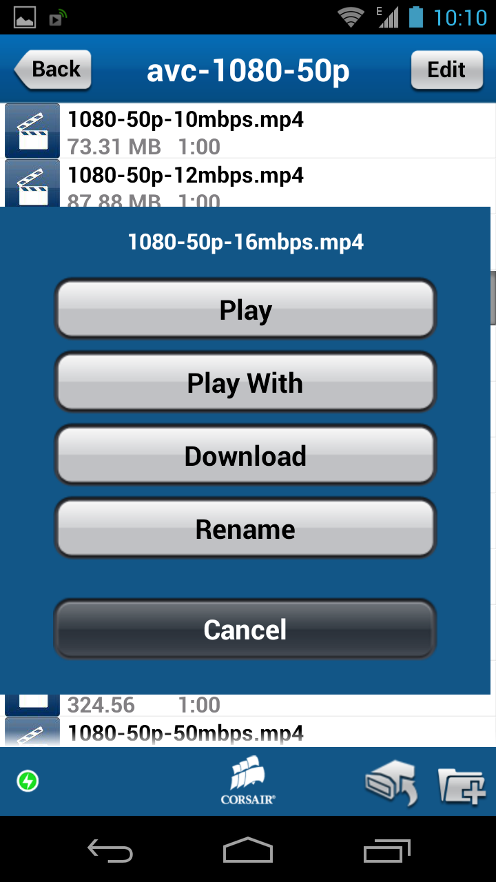 Первое тестирование этого режима мы провели совместно со смартфоном Sony Xperia Z, который подключался к беспроводной сети Corsair Voyager Air. Расстояние между устройствами составляло около четырех метров. В тесте использовалась оригинальная программа для доступа к накопителю и MX Player в качестве видеоплеера. Проигрывался файл формата 720p, созданный под соответствующий профиль YouTube. Время в этом режиме работы составило 7 часов 40 минут, что даже больше заявленного (впрочем, скорее всего, производитель перестраховался и указал цифру для модификации 1 ТБ). Интересно, что просмотр того же видео через DLNA предустановленным в смартфоне плеером показал результат в 8 часов 30 минут. Тестирование в штатной программе на Apple iPhone 4S с тем же роликом показало результат в 8 часов 15 минут.
