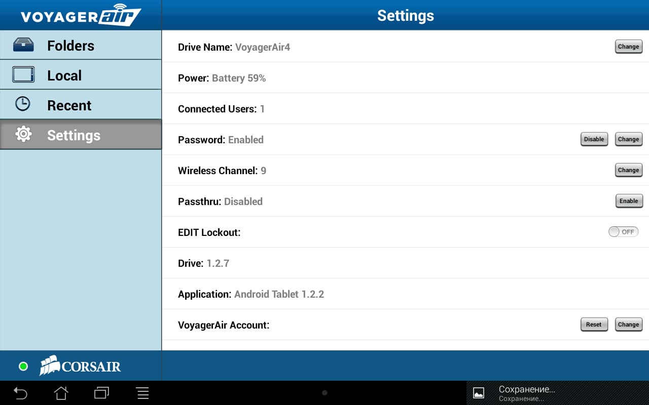 Накопитель имеет два сетевых интерфейса — проводной гигабитный и беспроводную точку доступа. Первый вариант позволяет использовать Corsair Voyager Air в качестве простейшего NAS с доступом через стандартное сетевое окружение Windows: IP-адрес он получает от роутера по DHCP, сетевое имя — VOYAGERAIR, общая папка одна, никаких пользователей и установки прав не предусмотрено.